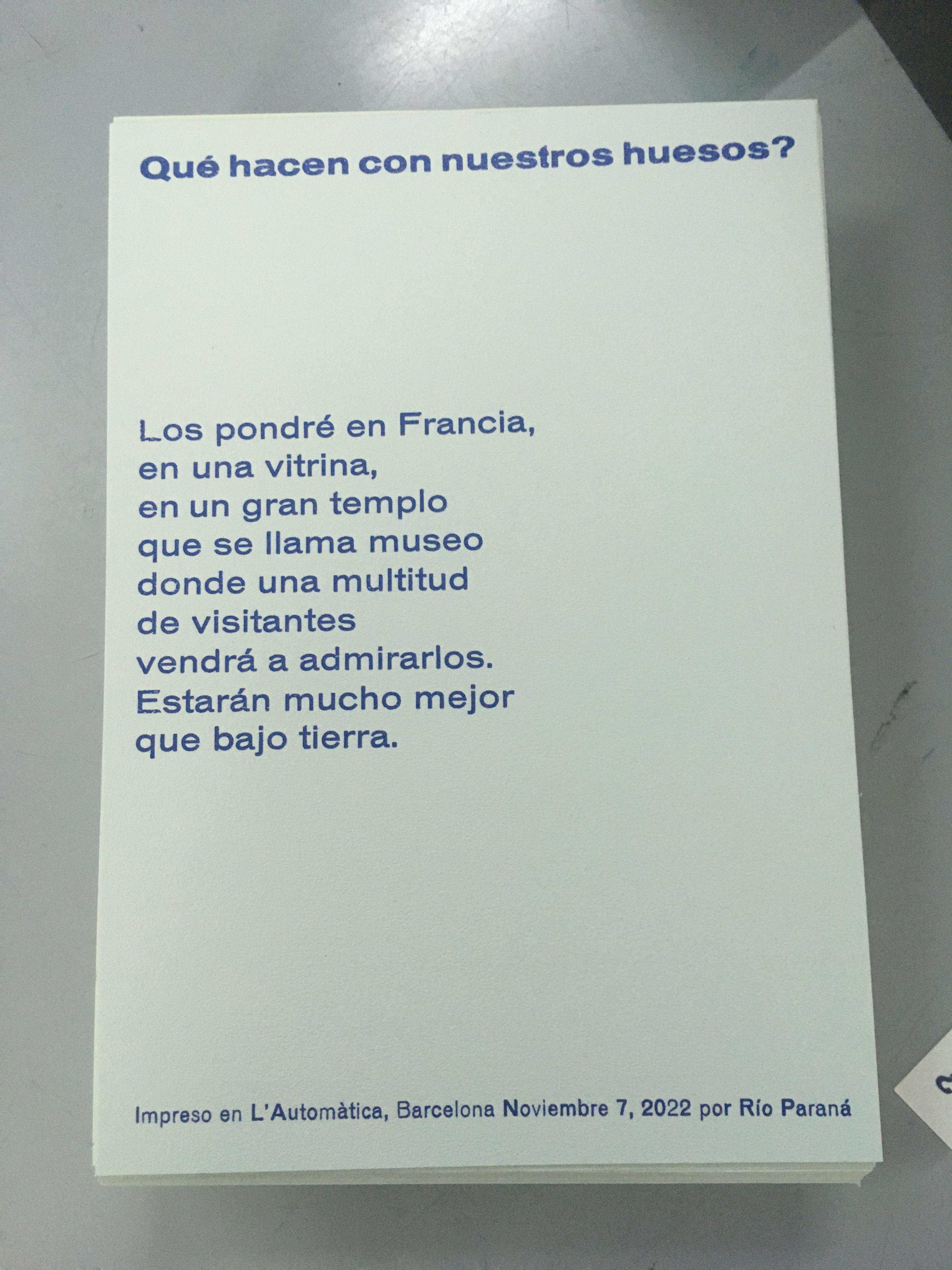 En un momento en el que los derechos de distintos pueblos indígenas están más amenazados que nunca por el monstruo del neo-extractivismo y el aparato del lucro, combinados con los poderes de los males no redimidos del pasado colonial, cabe preguntarse la importancia de aquellos cuerpos profanados y robados en el desarrollo del relato colonizador, y cómo desde sus bellas vitrinas validan una visión del mundo moderno donde Europa se siente superior a cualquier otro modo de entendernos en el mundo. Qué hacen con nuestros huesos es un intento de devolver a su territorio lo que fue profanado, una búsqueda de justicia, una insistente pregunta sobre qué sujeto puede ser expuesto y quién puede ser el espectador.